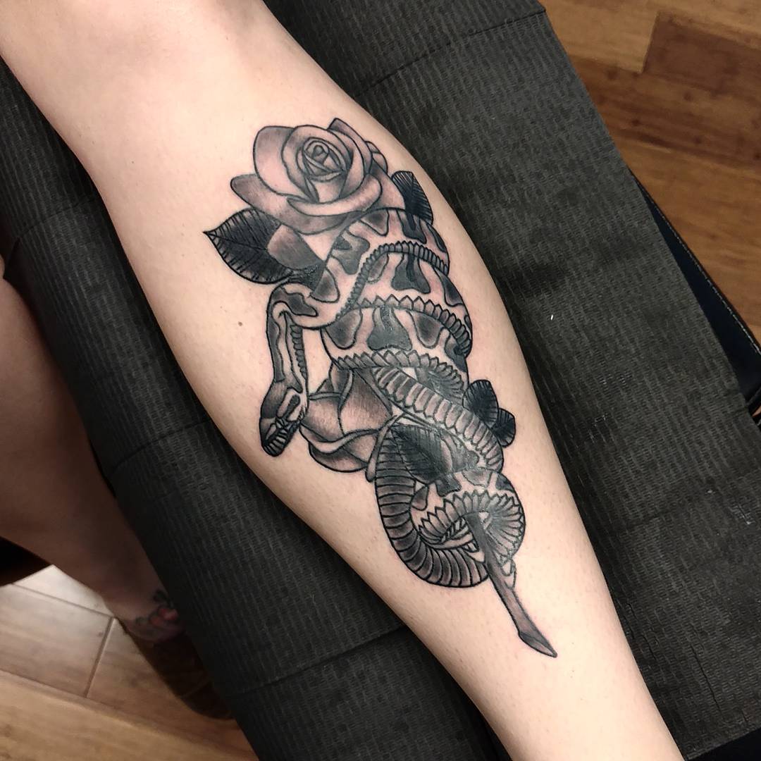 罗小姐小腿黑灰蛇缠玫瑰纹身图案