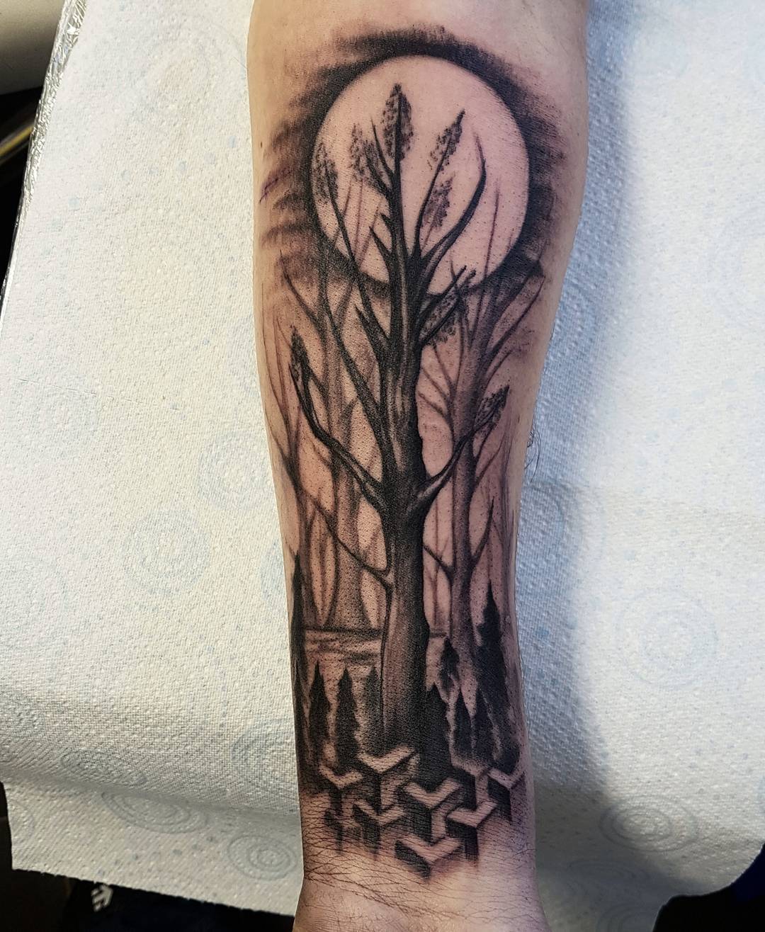 天津水电公寓做房产销售的查先生小臂黑灰写实树月亮纹身图案